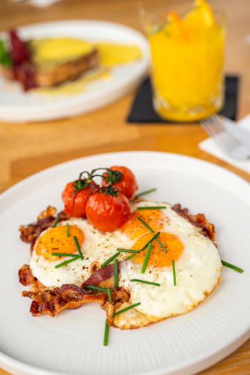 roasted bacon, beans in tomato sauce, fried egg, sausage, brown mushrooms, fresh orange juice
