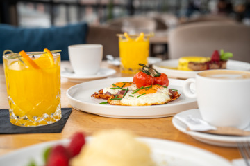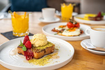 croissant filled with prosciutto crudo, parmesan and sun-dried tomatoes, Egg Frittata with salsiccia and potato, mascarpone with fruit, fresh orange juice