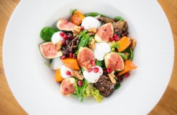 Salad with whipped goat cheese, chicory, arugula, lamb's lettuce, pear, beetroot, balsamic, walnuts