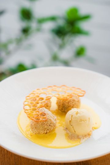 Ricotta dumplings, baked pears, chestnut puree, roasted almonds