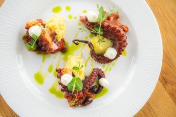 Grilled octopus, datterino tomatoes, chilli, eggplant, garlic,olives, capers, parsley, mashed potatoes with garlic oil