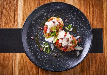Bruschetta with marinated tomatoes, pickled eggplant, parmesan