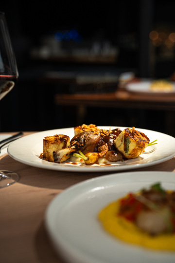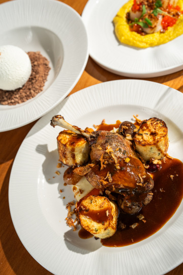 Confit duck leg, Jerusalem artichoke puree, glazed carrot,shallot, ricotta dumpling, duck jus with thyme