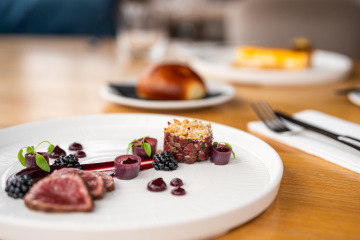 smoked venison tenderloin + venison tenderloin tartar, roasted pine nut and parmesan crust, marinated shallots in red wine, blackberry cream,
