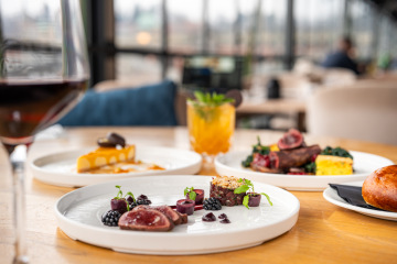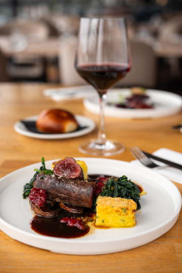 grilled fallow deer sirloin, baked potatoes "aglio olio", cavolo nero with confit garlic, pickled portobello mushrooms, demi glace with cranberries